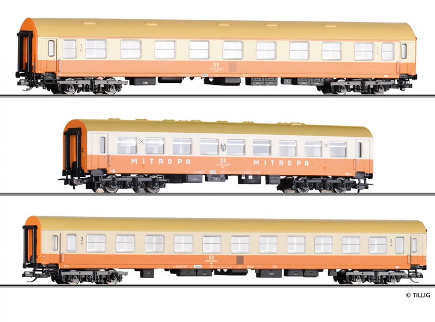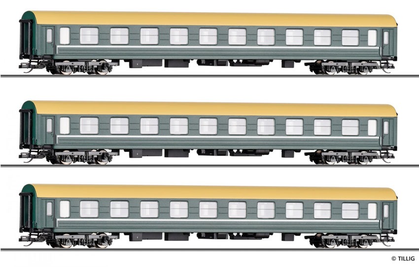 Art.-Nr.: 70064 Reisezugwagenset „Städteexpress“ der DR, bestehend aus einem Reisezugwagen Typ Y/B 70, einem Speisewagen und einem Reisezugwagen Bauart Halberstadt, Ep. IV |
